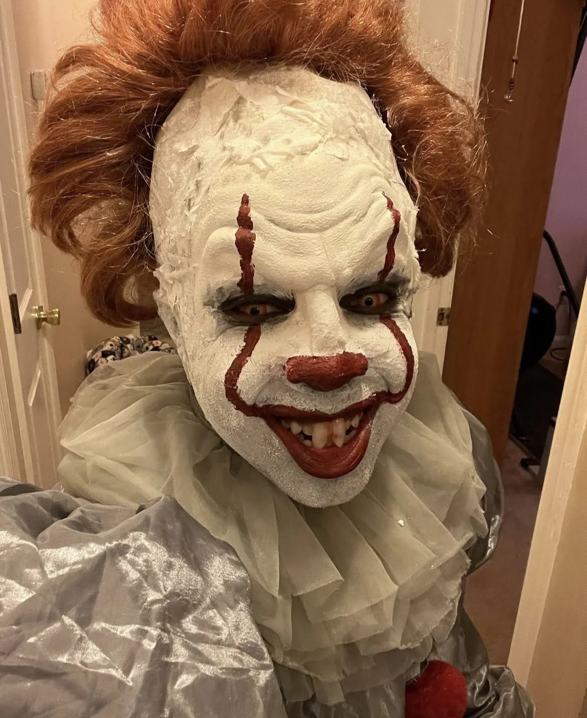 A recreation of Pennywise the clown from the “IT” franchise using foam latex and watercolor and cream makeup