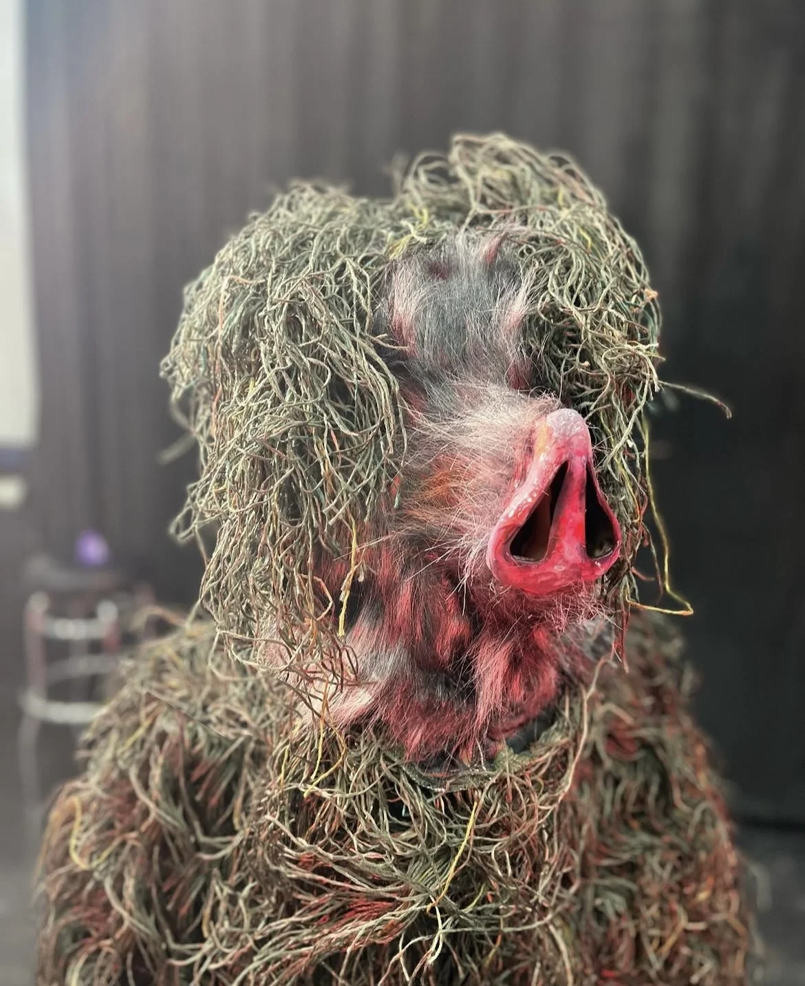 A boar-like creature I made on a model using a latex prosthetic, and fake moss and fake branches